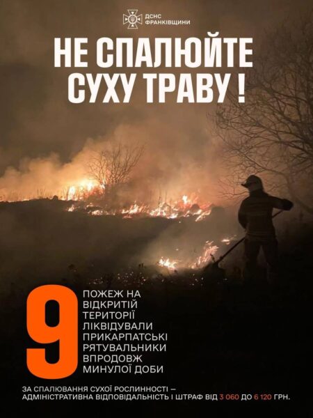 Впродовж минулої доби рятувальники ліквідували дев’ять пожеж у природних екосистемах на Прикарпатті. Загальна площа загорянь склала близько 0,5 […]