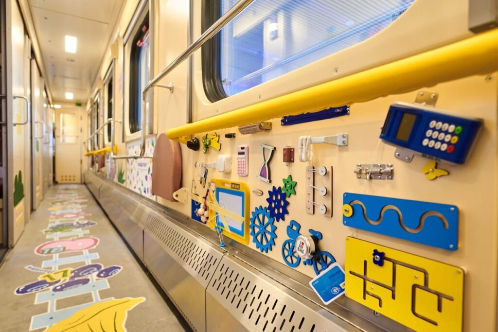 Вагони повністю оновили: вони отримали освітні й інтерактивні елементи, а також рішення для безпечних подорожей із дітьми. Зокрема, встановили поручні відповідно до зросту дитини, захист для верхніх полиць, сповивальні столики, манежі для сну та підігрівачі дитячого харчування.